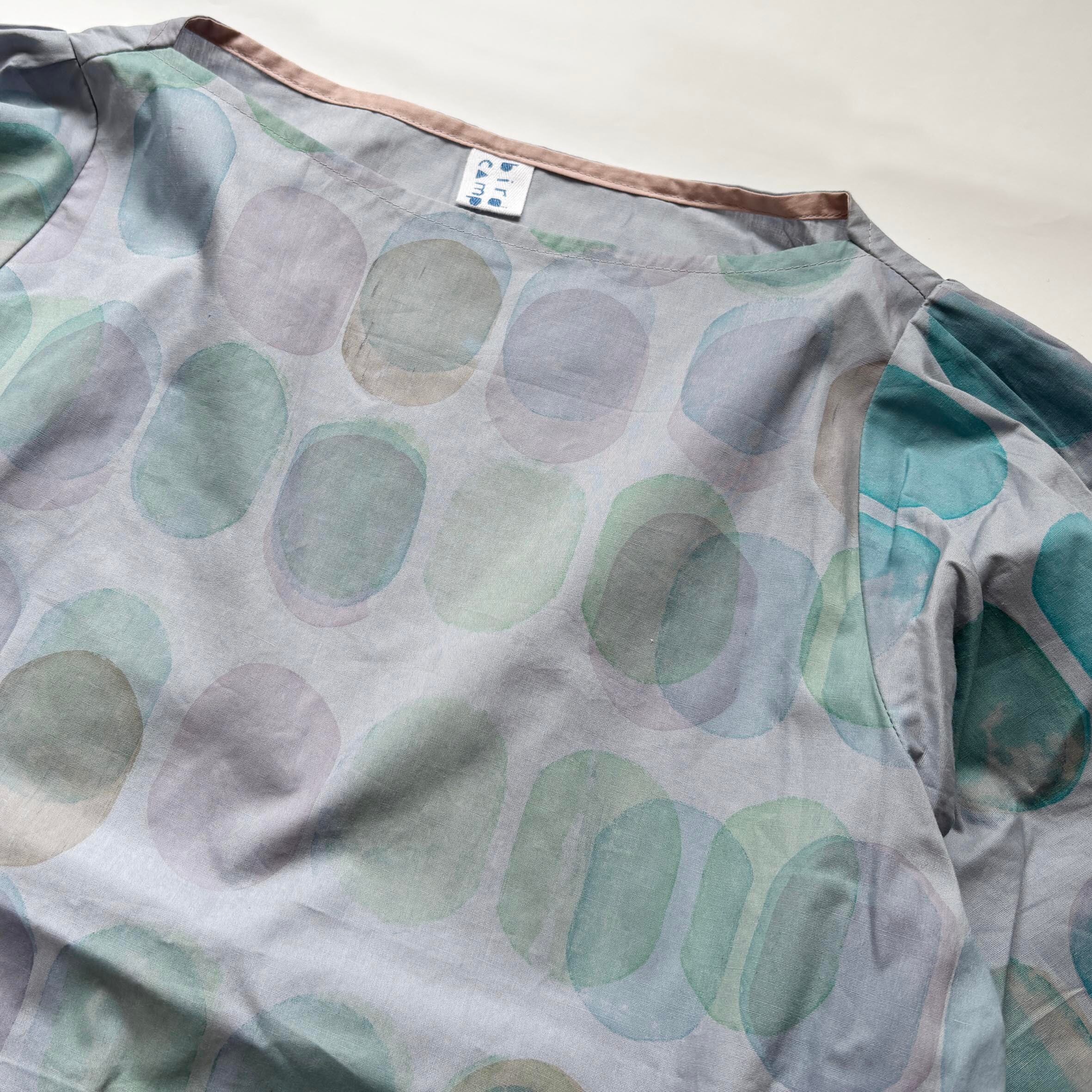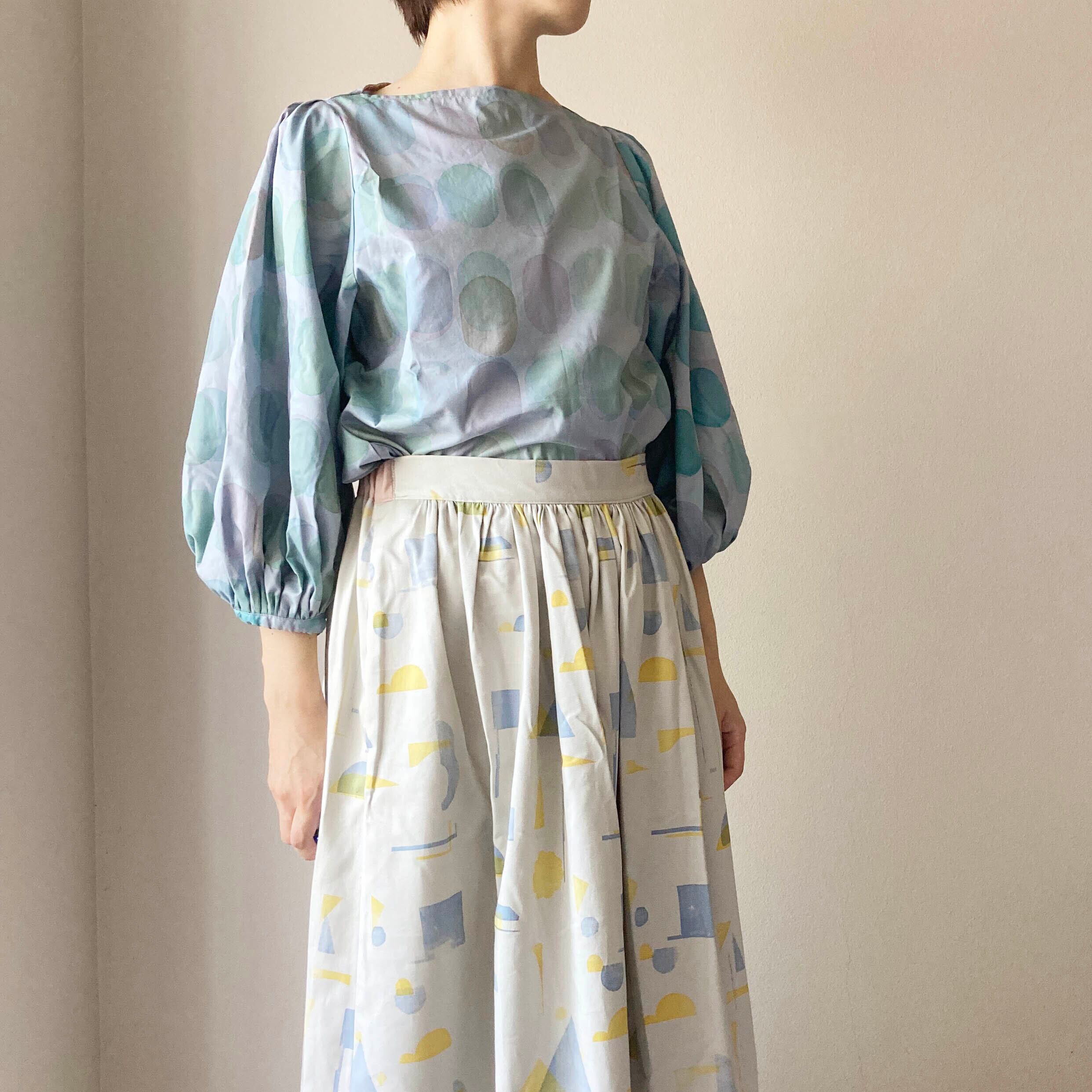 水彩のように透明感のある色の重なった楕円が並ぶプリントのカットソーです。