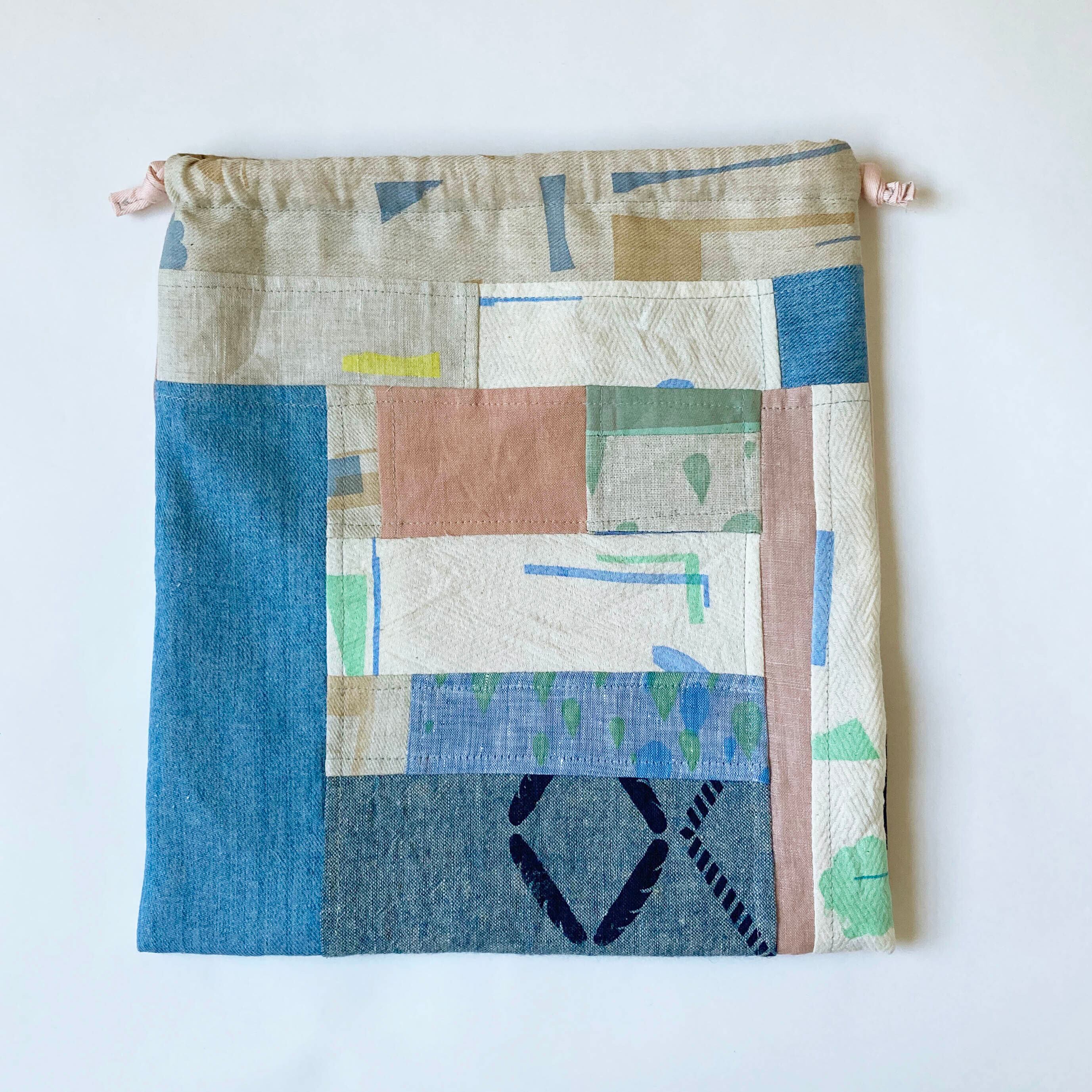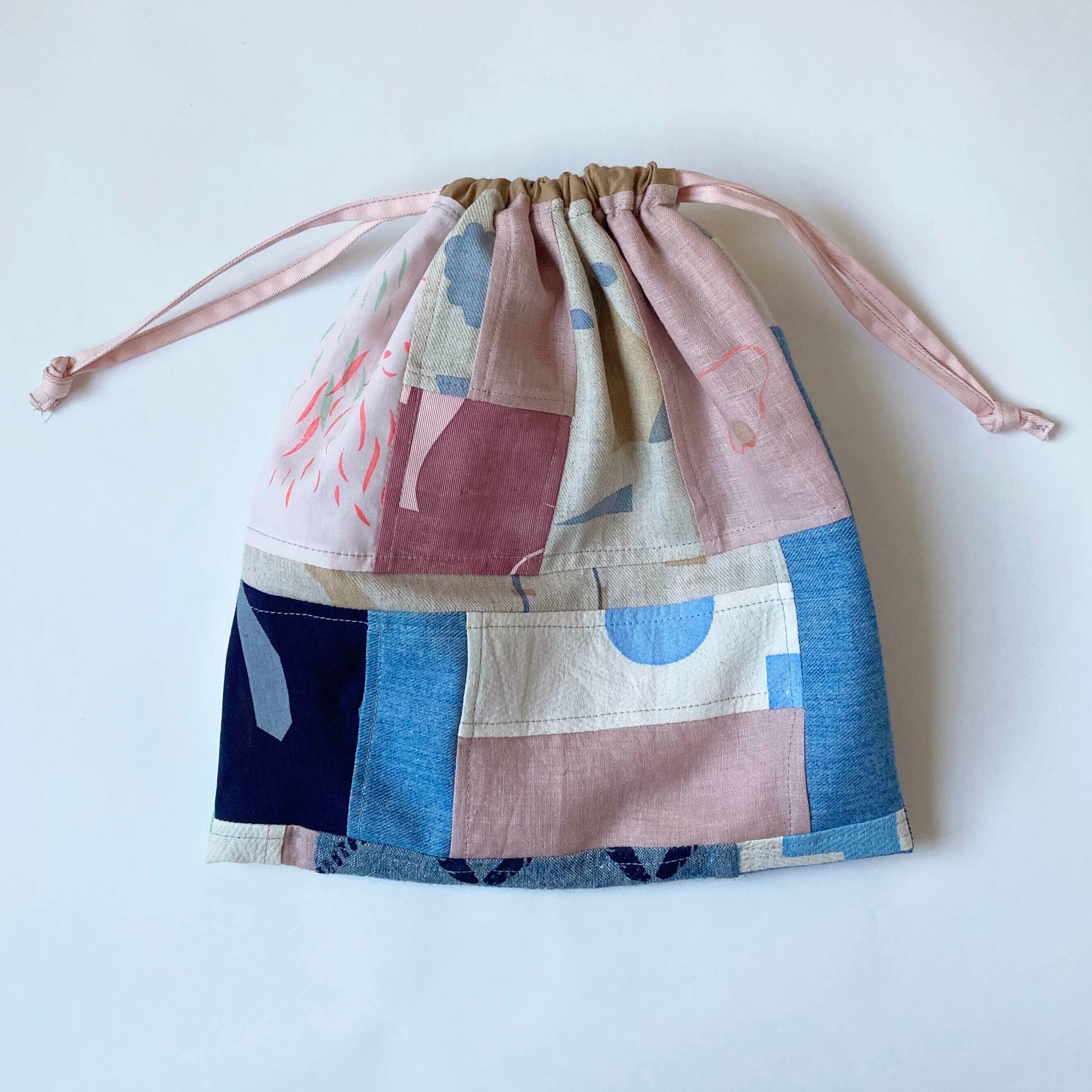 今までプリントした様々な生地をつぎはぎした巾着です。
